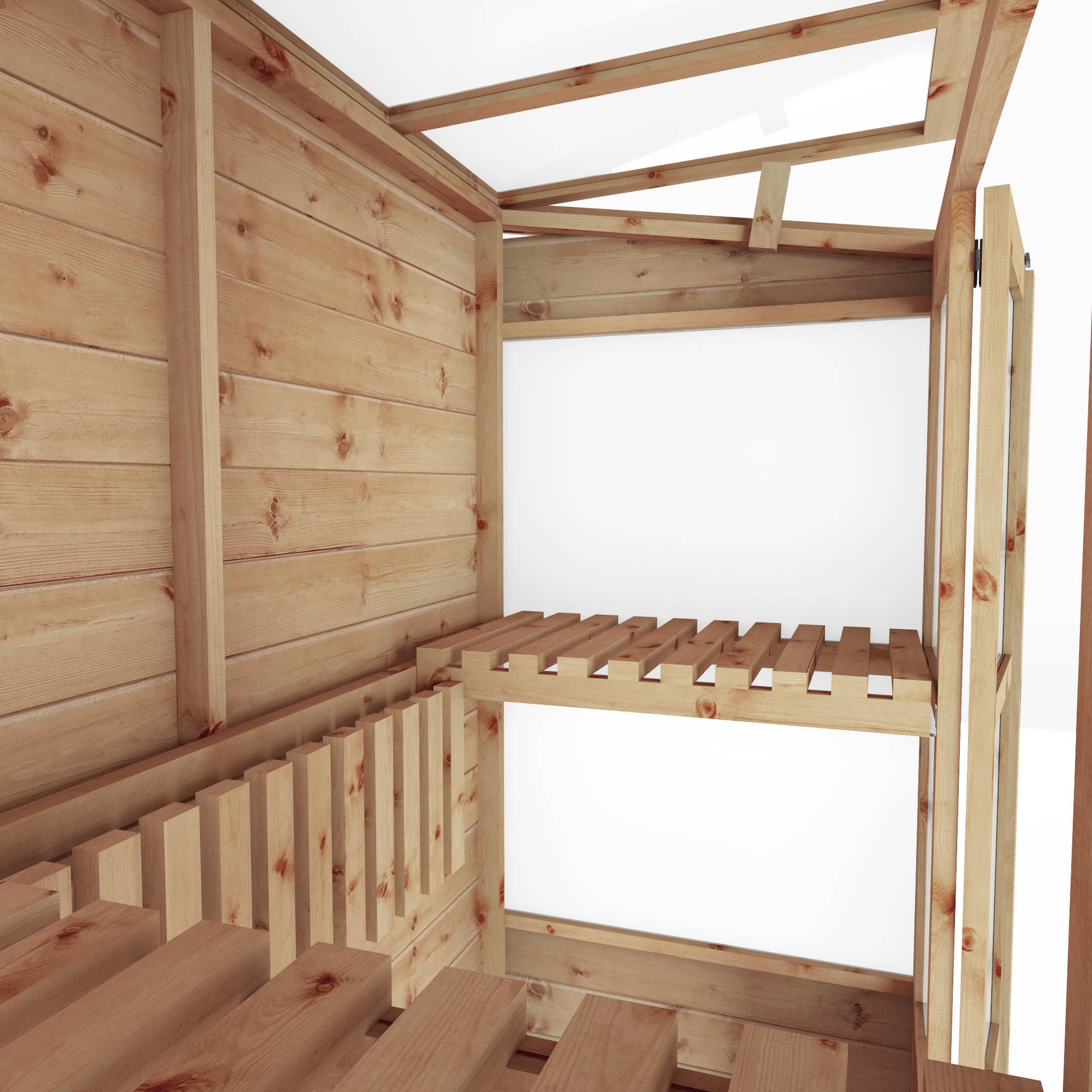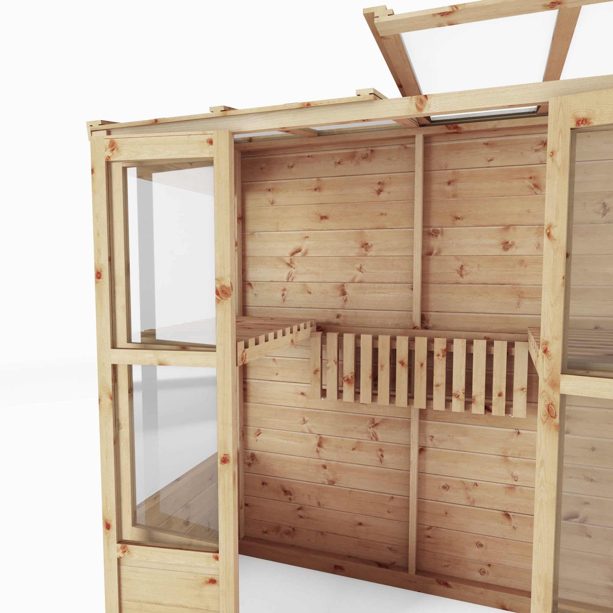 The lower walls of this growhouse are constructed using premium horizontal interlocking tongue and groove boards with a shiplap profile. The shiplap profile includes a protective and aesthetically pleasing lip to create a strong, weatherproof panel. Complete with thick wooden framing to support the cladding internally, this building offers a rigid and long-lasting structure.