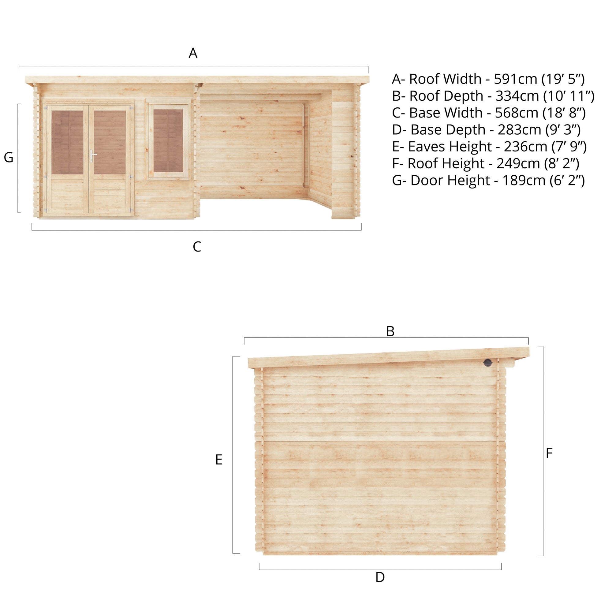 By incorporating a patio area, you can enjoy the outdoors while staying sheltered. Perfect for relaxation, it can transform into a cosy outdoor space, a hot tub hideaway, or a shaded area for children to play away from the sun. Please note, you can place the patio on either side of the building to fit your preferences. The log board thickness for the patio area is 28mm.