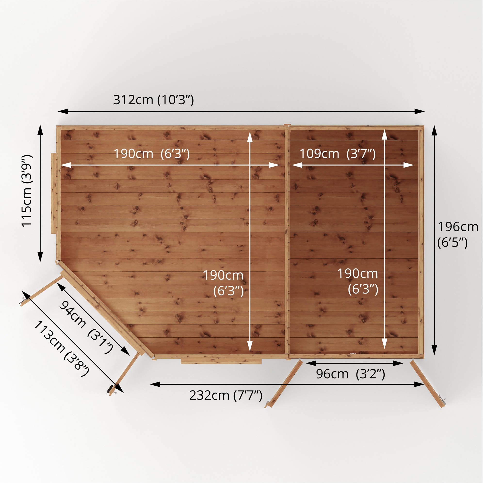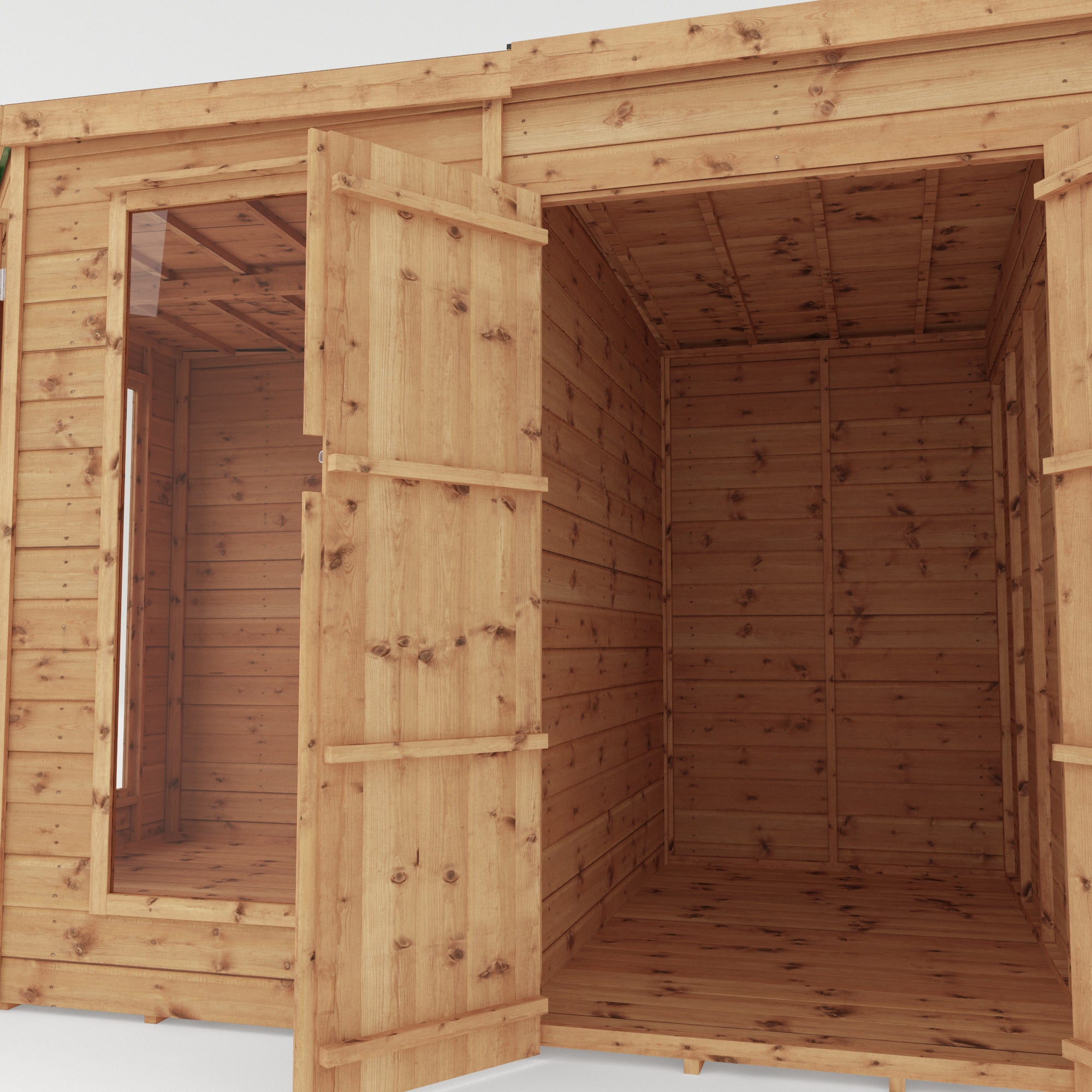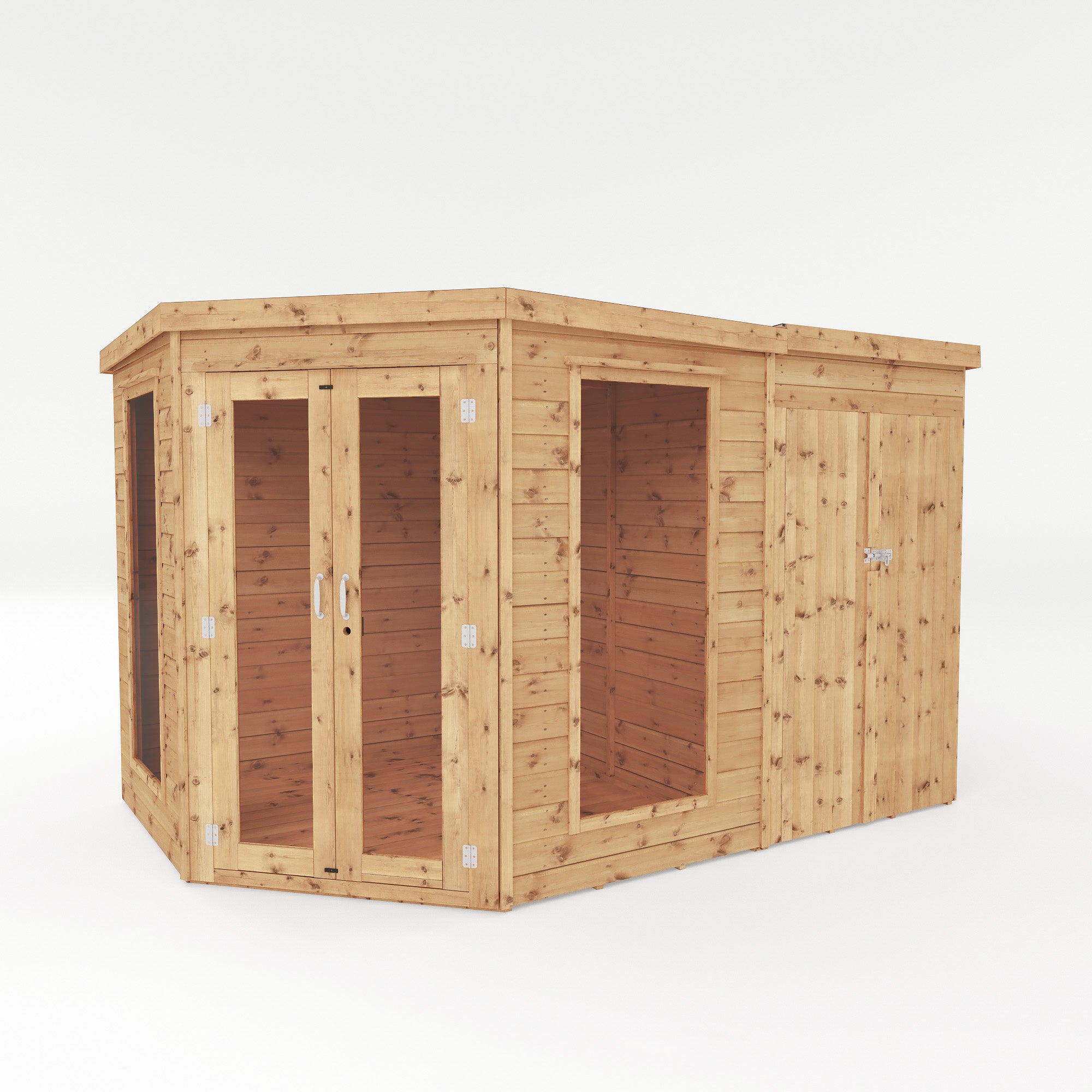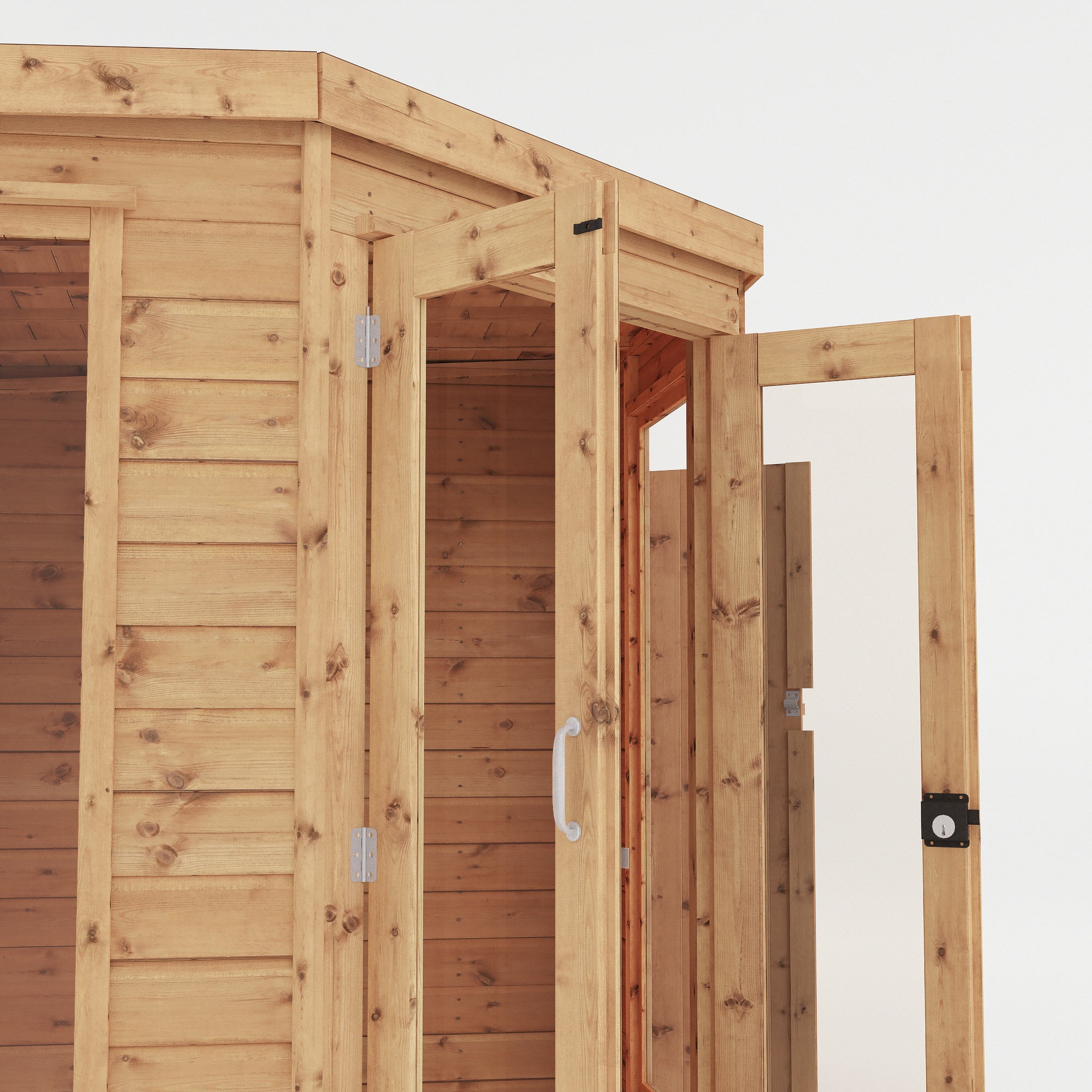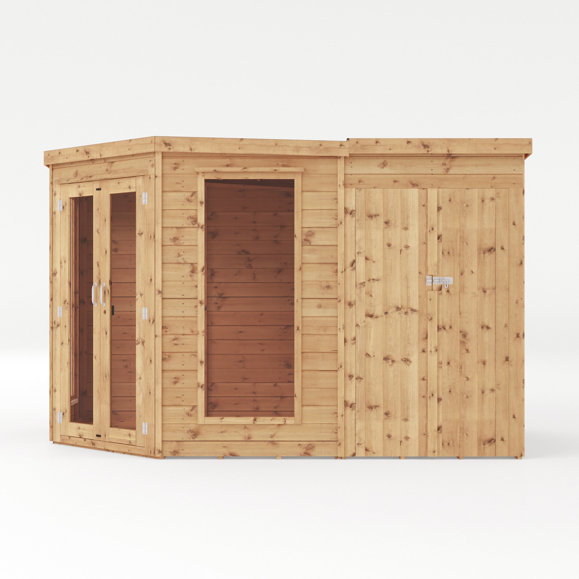 With its pent roof design, the Corner Summerhouse with Side Shed offers a sleek and contemporary design. Its sloped roof helps the building tuck away unnoticed in any garden space, whilst providing a cosy and snug inside feel.
