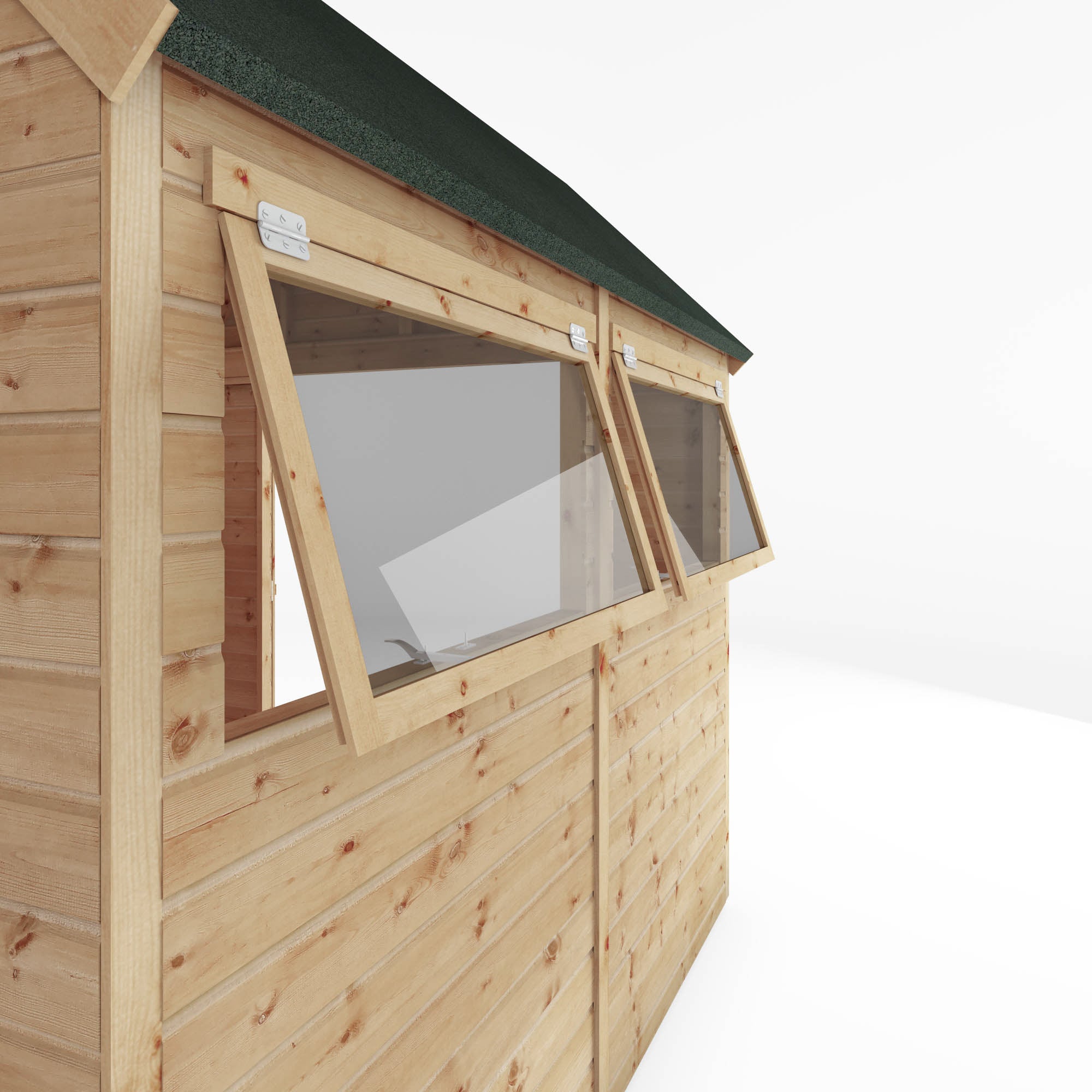Our Premium Dutch Barn Shed is a unique and spacious storage solution. The smaller of our dutch barns, the spacious interior is ideal for storing any outdoor equipment you'd like away from your home, or even seasonal items such as Christmas decorations. The stylish Dutch barn roof also provides this shed with a generous roof height. Making it the ideal place to store tall items such as strimmers and ladders. Featuring double doors, this shed makes accessing and storing your items super easy. An opening Styrene glazed window floods this shed with light, creating a bright and welcoming interior. Perfect if you are planning to use this space as a functioning workshop or hobby room. We manufacture this building here in the UK, using sustainably sourced and certified timber.Shiplap sheds are created by cladding which comprises of several timber boards stacked on top of one another to form a seamless panel. With a groove at the top of each board, this encourages water run off and ensuring the interior remains dry as well as air tight.