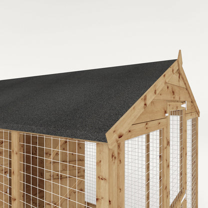This wooden pet house and run consists of two parts; an open mesh area to the front and a spacious shelter at the back. The two sections are connected by a stable door, to allow your dog freedom between sitting out and enjoying the fresh air, or snuggling up inside. Featuring a full height roof, not only does the dog run feel spacious and airy, but it also makes maintaining and cleaning the kennel simple and easy!
