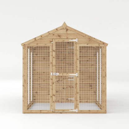 The walls, floor and roof are made using interlocking 12mm Tongue & Groove cladding; this creates a solid structure that is guaranteed to offer many years of reliable service. Two doors feature in this dog kennel, one that enters the sheltered area and one that enters the open faced section. A small doorway connects the sheltered area and run itself so your dog is never restricted. The mesh used in the front of the panel is galvanised, this increases the longevity of the building.