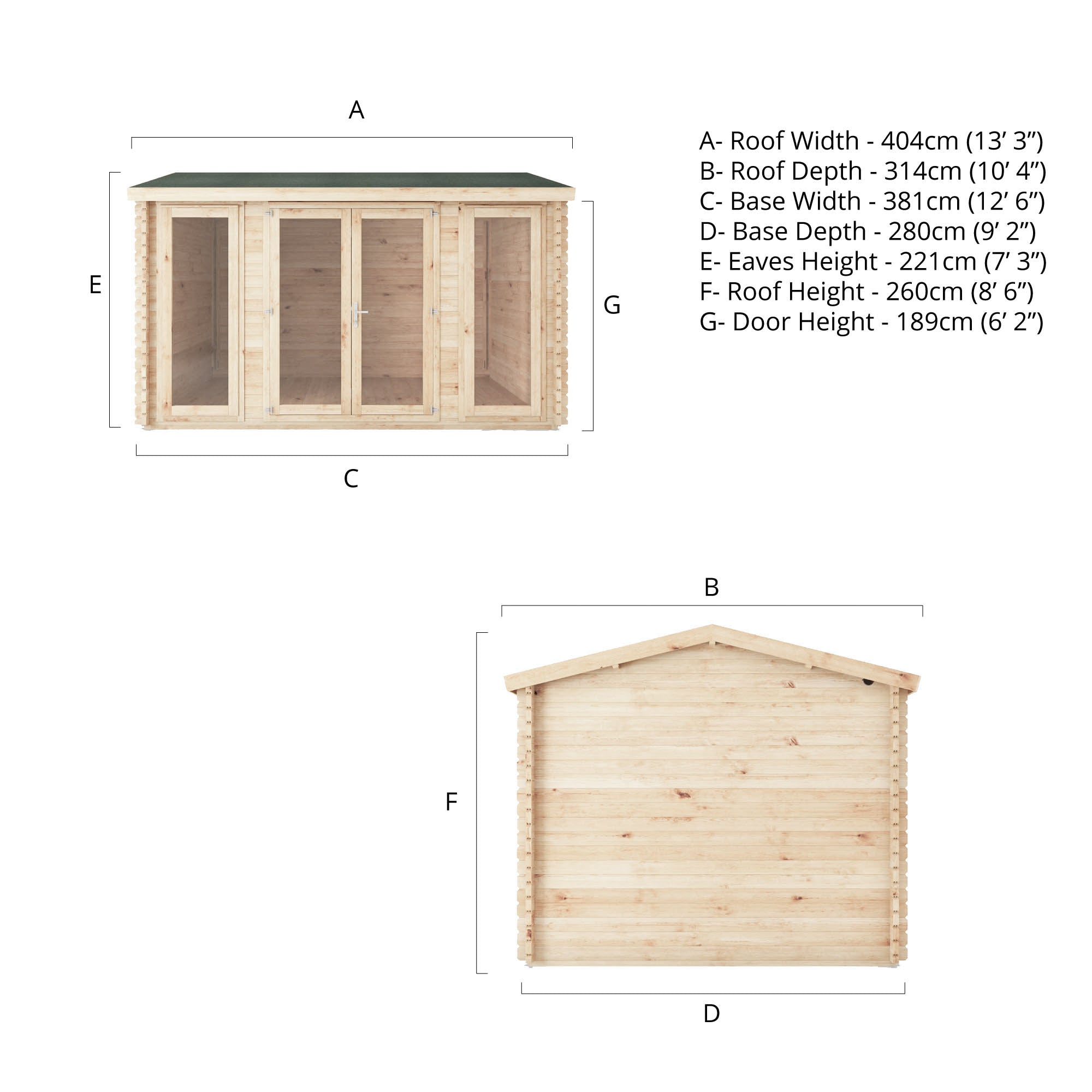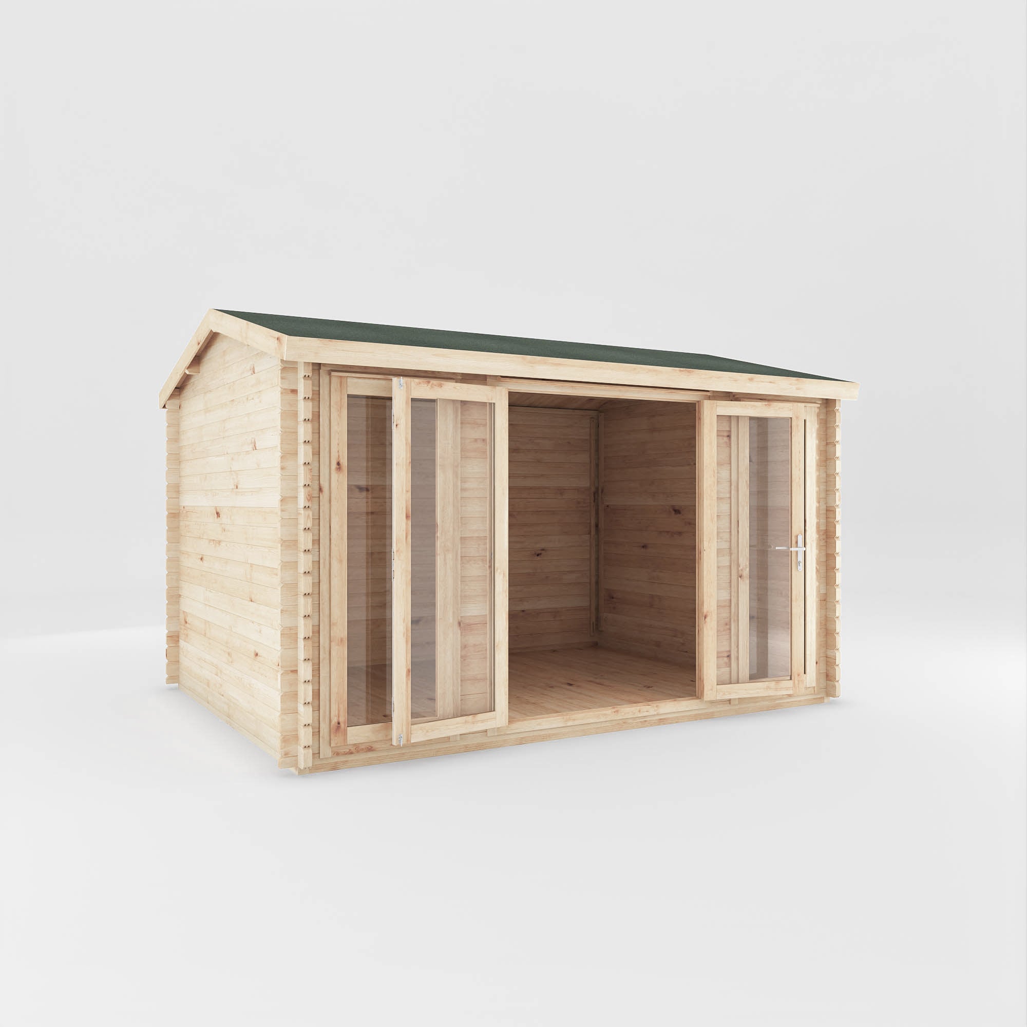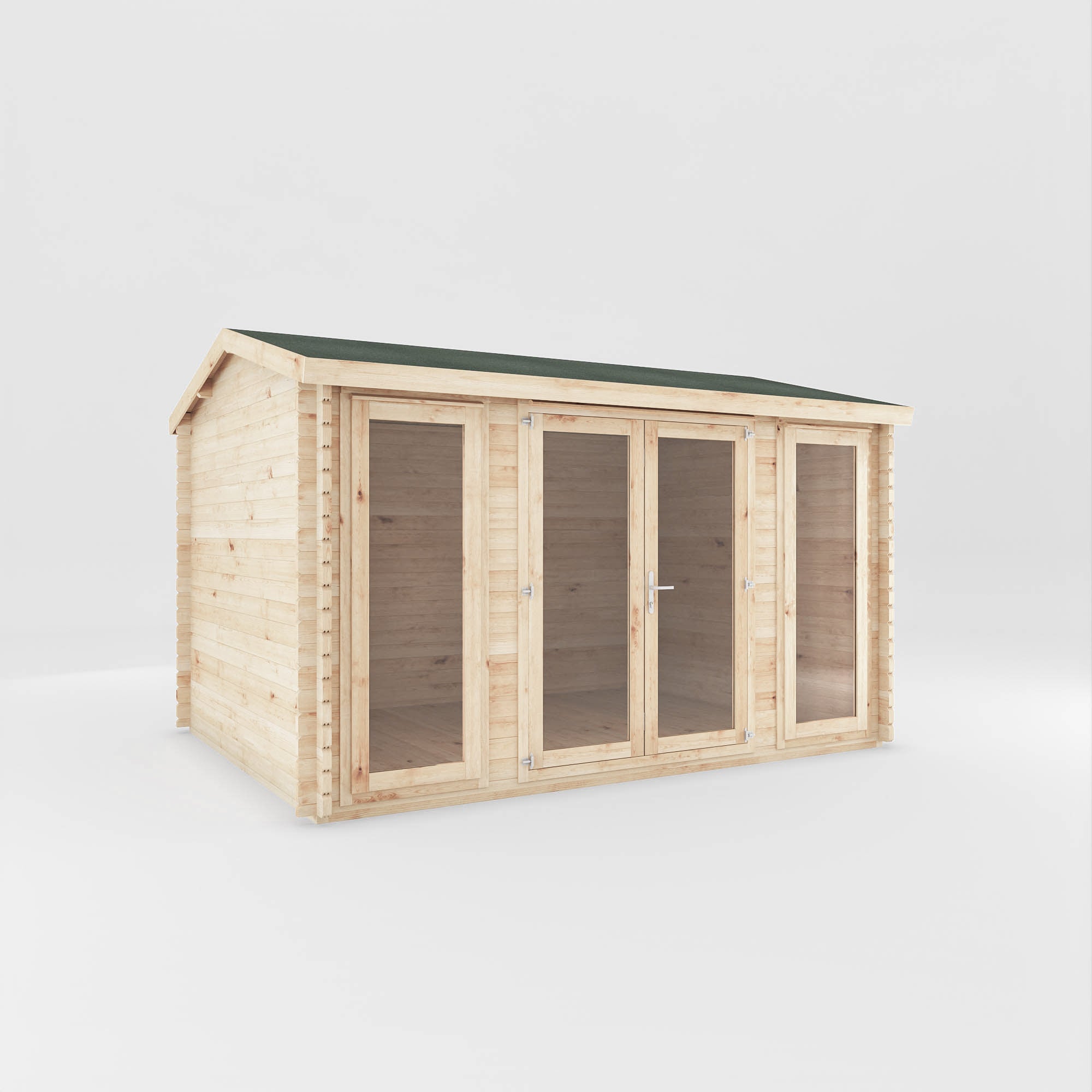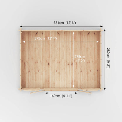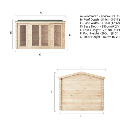 The Dove Log Cabin offers a choice of three log thickness options: 28mm, 34mm, or 44mm interlocking boards, all designed to suit your unique preferences. Opting for thicker log boards brings about several advantages. The heightened wall thickness improves insulation, ensuring the cabin remains adaptable and comfortable throughout the entire year, creating a cost effective space which can be used throughout the seasons. Moreover, selecting thicker walls enhances the interior's tranquillity, creating a serene space perfect for both work and play. No matter which you choose, every log cabin we offer is crafted exclusively from ethically sourced and certified timber, meticulously produced here in the UK by our highly skilled team.