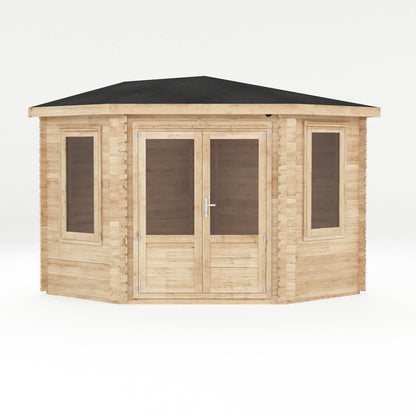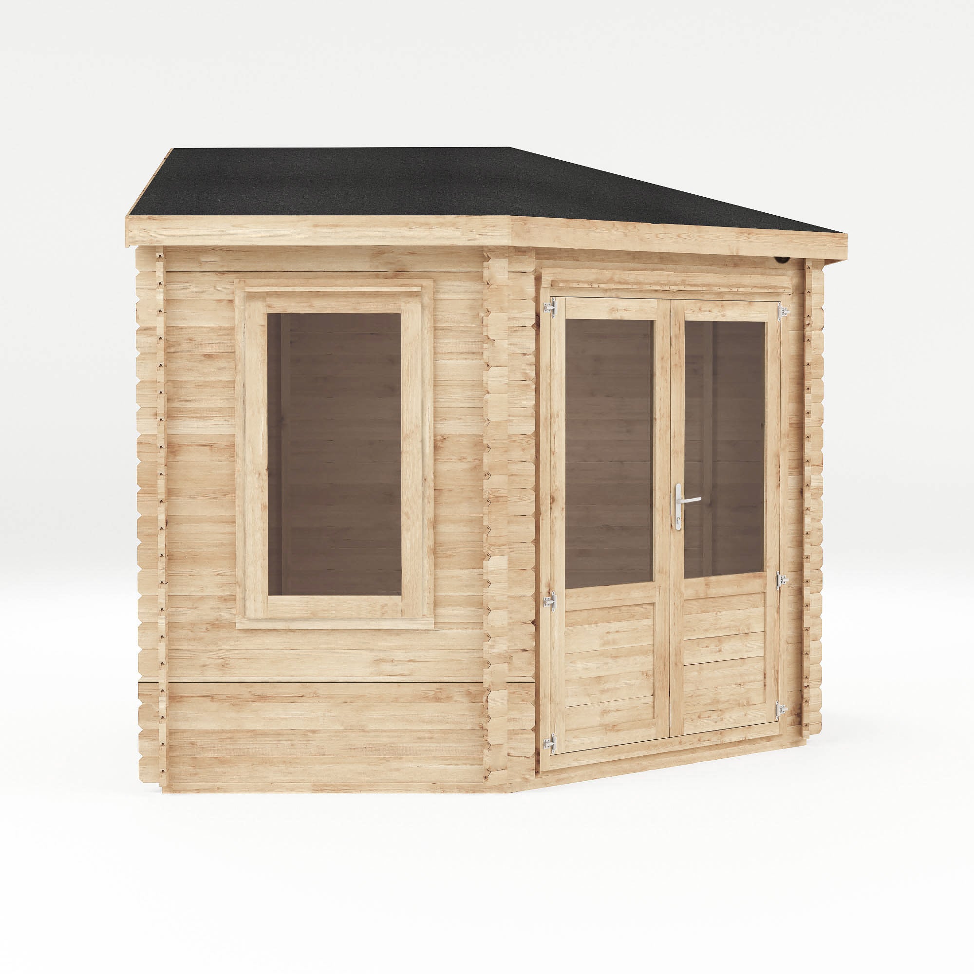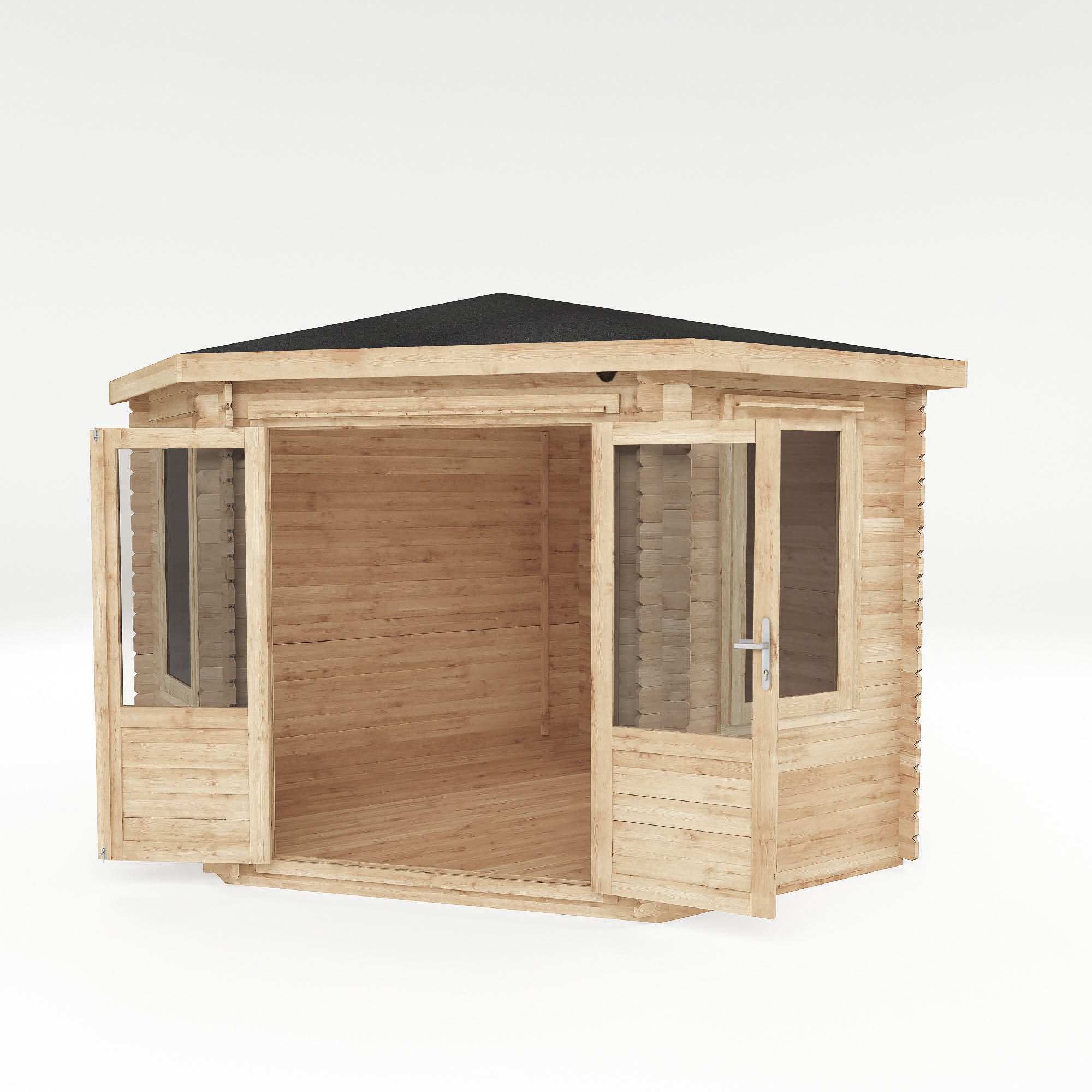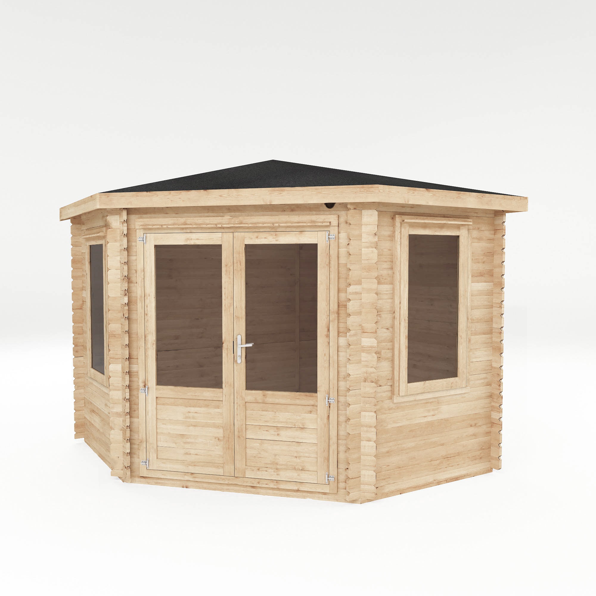 The Goldcrest Corner Log Cabin with offers a stylish and contemporary corner design, with traditional features and will complement any style of garden. Featuring two large opening windows and a half glazed double door, this cabin offers a bright and airy interior space to enjoy.