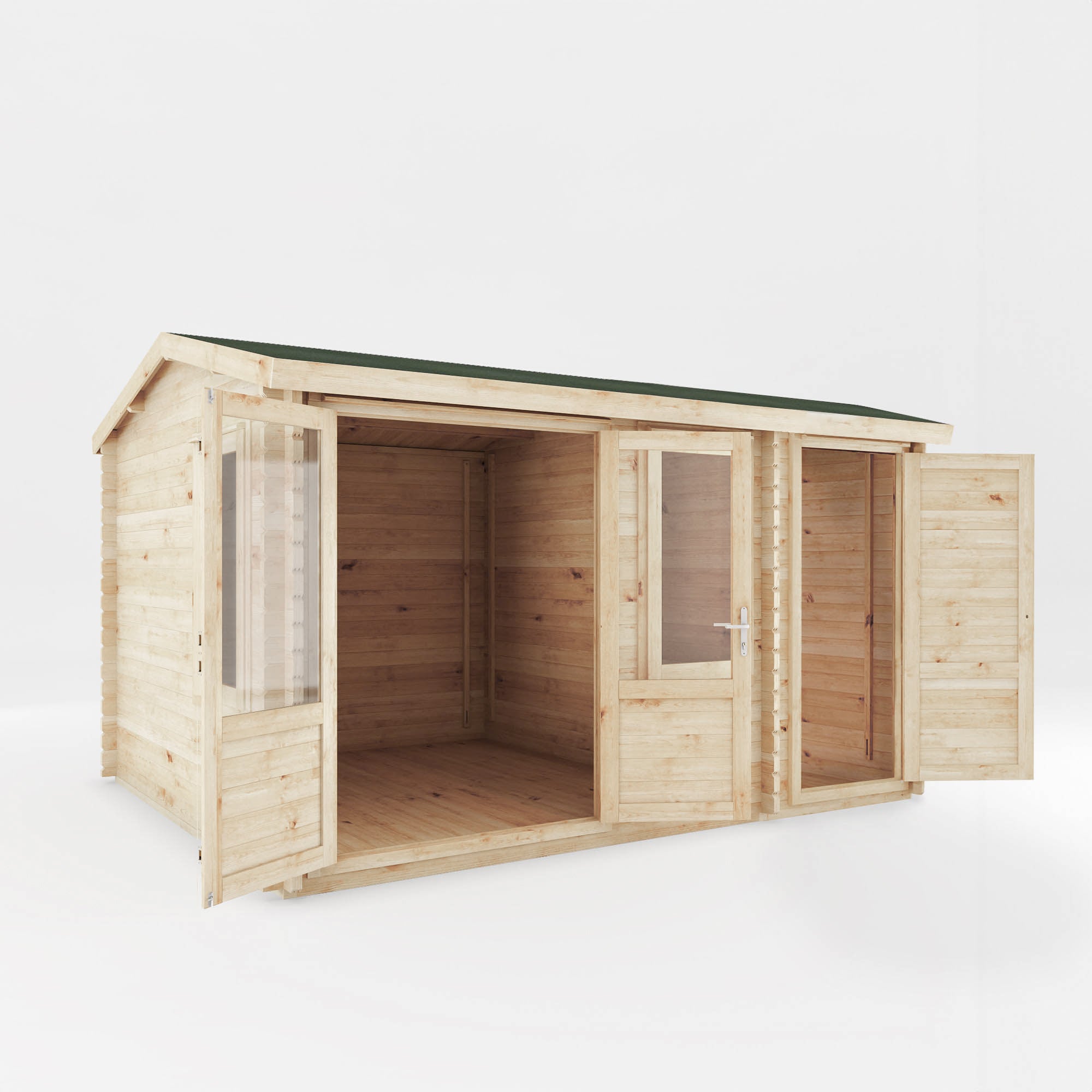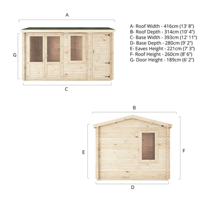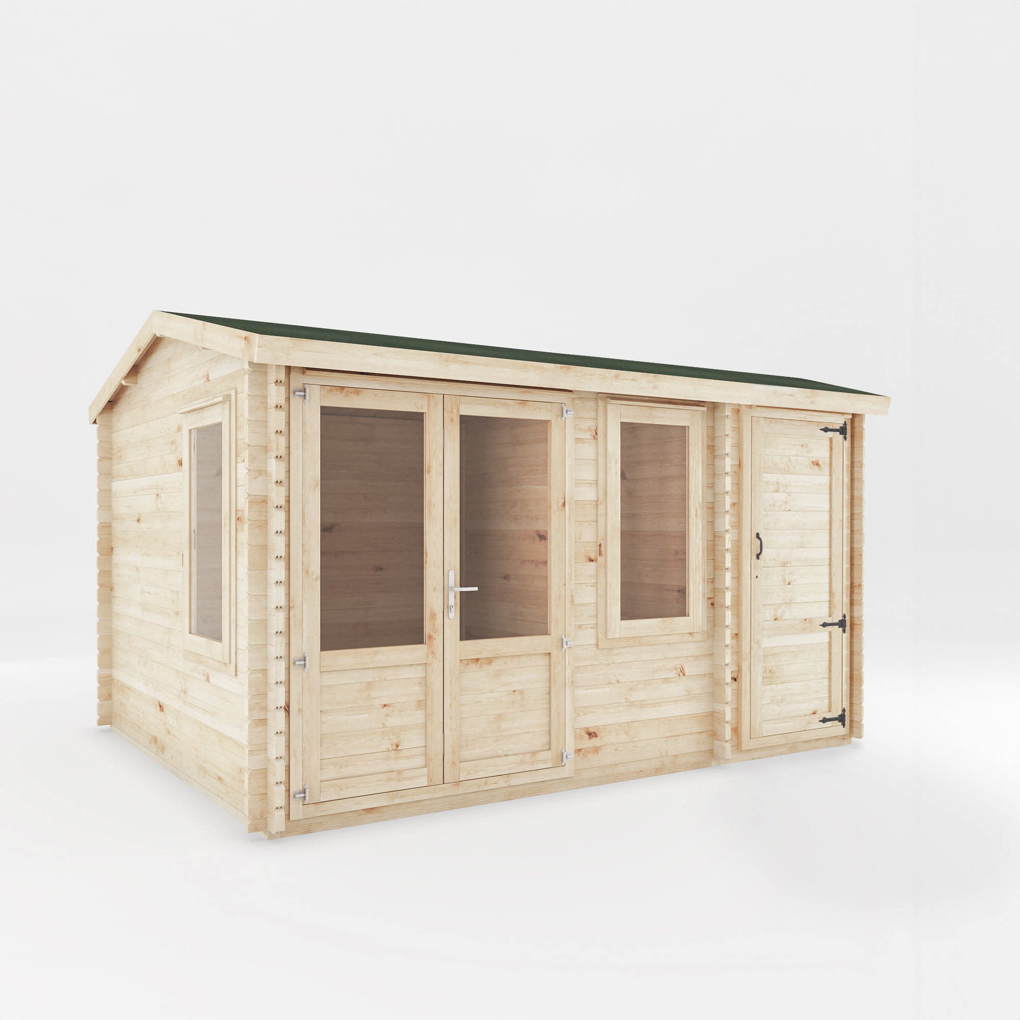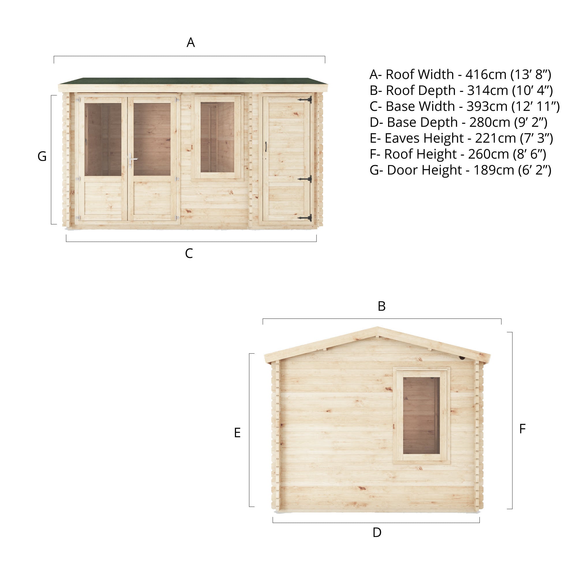 The Robin Log Cabin with Side Shed offers a spacious and inviting garden space, ideal as a relaxing hideaway or as a comfortable and productive home office space. Its classic features, including an Alpine-inspired apex roof and bright opening windows, ensure a timeless design that effortlessly blends with your surroundings. The traditional apex roof not only adds to the cabin's charm but also enhances the interior space, allowing for the incorporation of taller furniture and decorations, creating a sense of openness and flexibility.