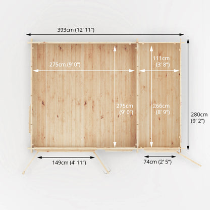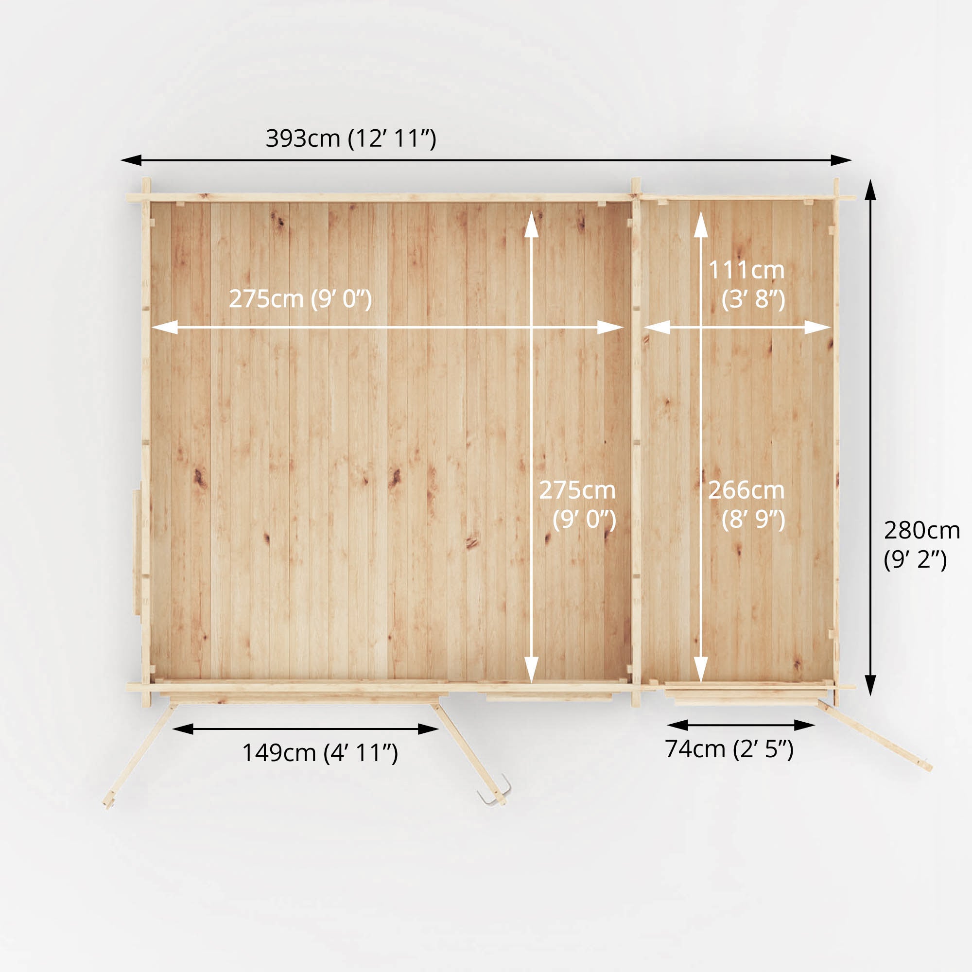 Our Robin Log Cabin with Side Shed is available in three log thicknesses. We offer this cabin in 28mm, 34mm or 44mm interlocking boards depending on your requirements. Opting for thicker log boards has several advantages – thicker walls offer better insulation from heat during the summer and the cold in wintertime meaning your new log cabin is more versatile and usable throughout the year. Thicker walls also help to reduce noise from outside for added peace and tranquillity away from the hustle and bustle of day-to-day life. No matter the thickness you opt for, all of our log cabins are made using only ethically sourced and certified timber and are all made here in the UK by our highly skilled team.